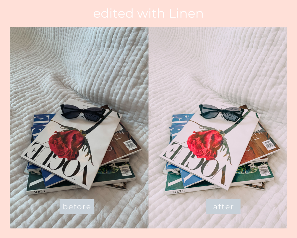 This collection was truly inspired by a minimalistic approach to a colorful feed. For those who love bright colors and whites, this preset is for you. Many presets from other creators tend to neutralize colors but over-expose the brightness. With this collection, I have created a one-click edit that enhances the colors around your photo but still focusing on your natural beauty. This has been my inspiration lately, and I felt like this was a perfect collection to release for the summer. Pastel pinks, oranges, blues and greens - With exposed whites and little contrast. These presets are perfect for all skin tones and hair colors and will soon be your new favorite as well.